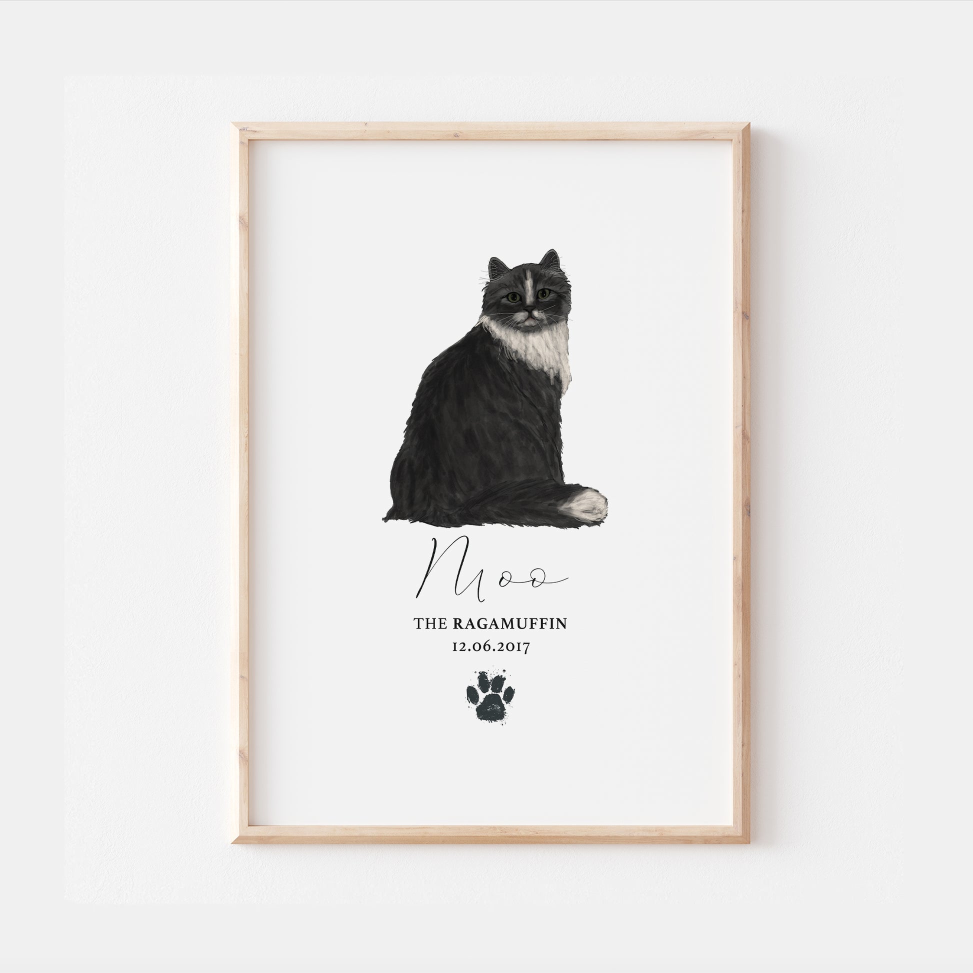 Our personalised Black & White Ragamuffin Cat print will be a great addition to any room in your home.