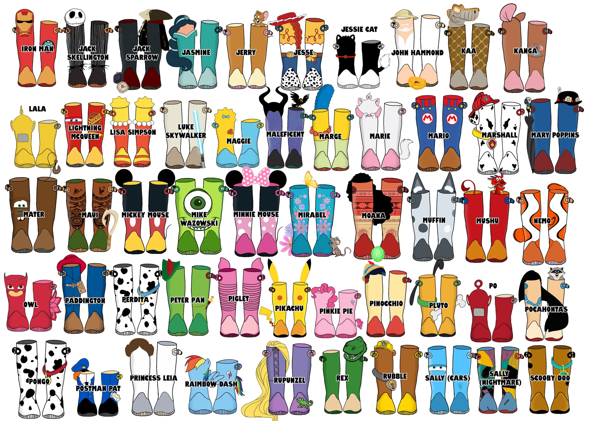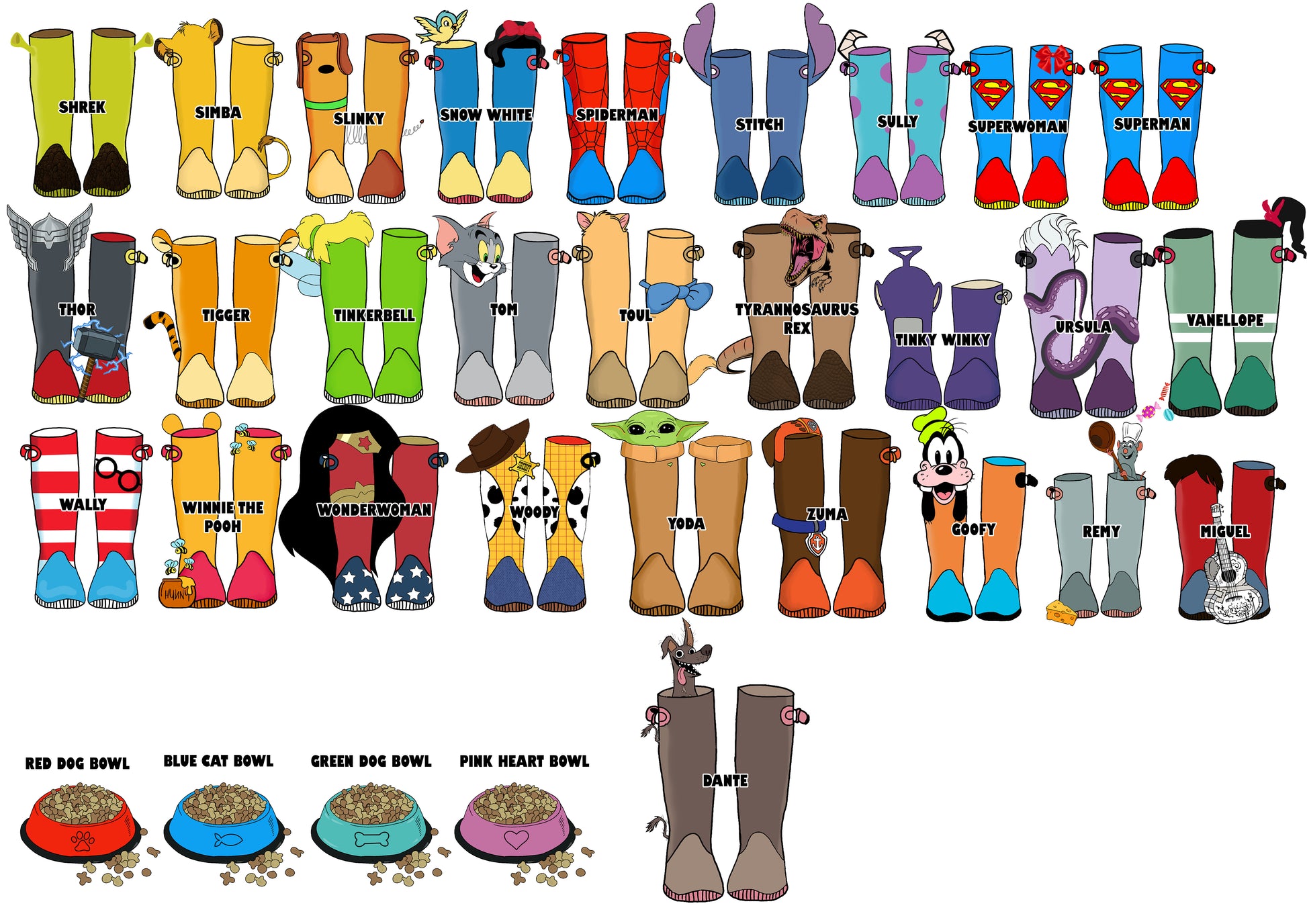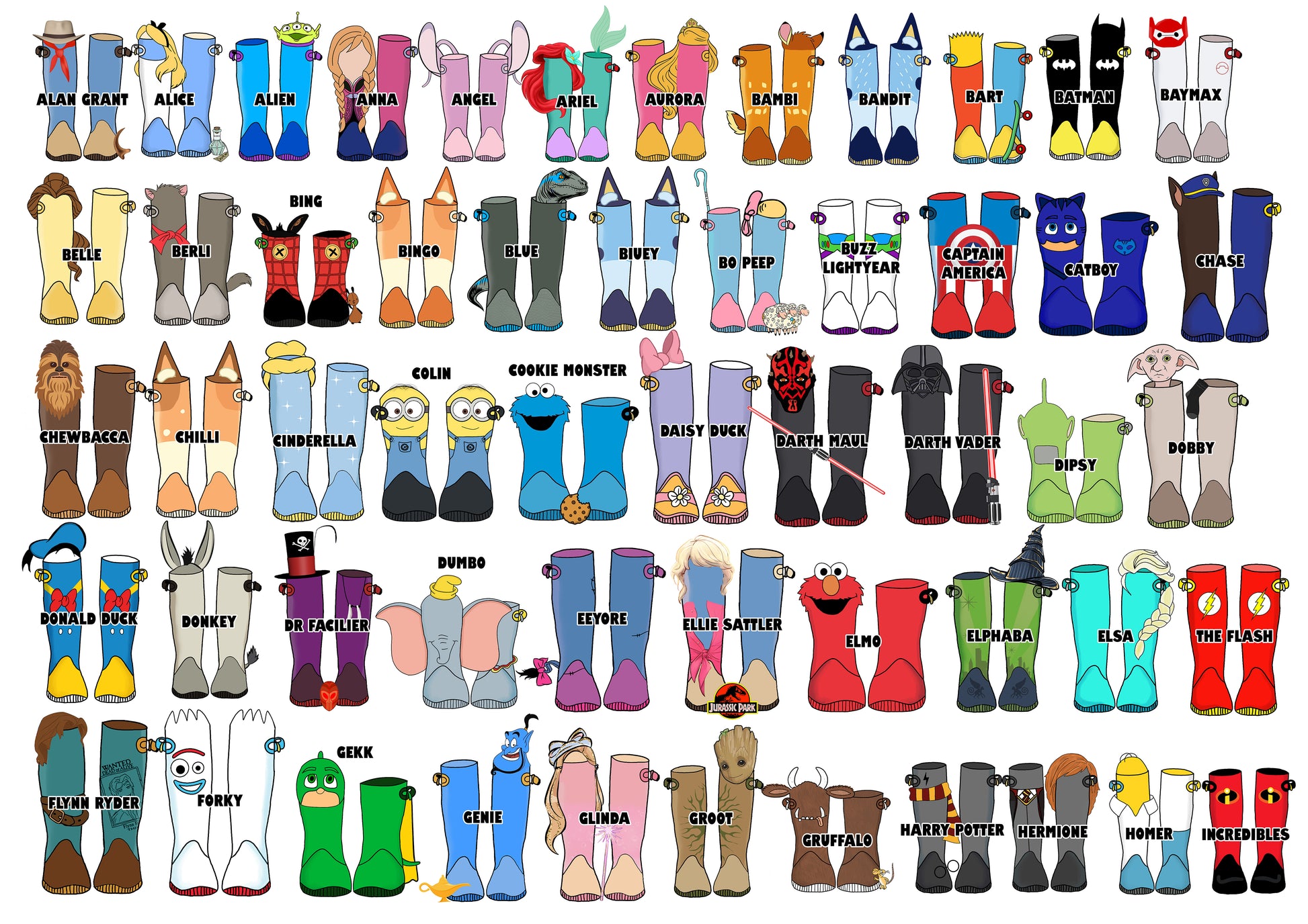 Alice, Alien, Ariel, Anna, Angel, Aurora, Alan Grant, Bart, Bandit Heeler, Bambi, Batman, Baymax, Bo Peep, Belle, Berli, Bing, Bingo, Bluey, Blue, Buzz, Catboy, Cookie Monster, Captain America, Chase, Cinderella, Chilli Heeler, Chewbacca, Colin, Daisy Duck, Dante, Darth Vader, Darth Maul, Dipsy, Dobby, Donald, Donkey, Dr Faciliar, Dumbo, Elmo, Elsa, Elphaba, Eeyore, Ellie Sattler, Flash, Flynn Rider, Forky, Gekk, Genie, Gruffalo, Groot, Glinda, Goofy, Harry Potter, Hermione, Hello Kitty, Homer, Iron Man, Mr Incredible, Jack Skellington, Jack Sparrow, John Hammond, Jasmine, Jesse, Jerry, Jessie Cat, Kaa, Kanga, Luke Skywalker, Lightning McQueen, Lala, Lisa, Maggie, Marge, Maleficent, Marie, Mary Poppins, Mario, Marshall, Mater, Maui, Mickey, Muffin, Mushu, Moana, Mike Wazowski, Minnie, Miguel (Coco), Mirabel Madrigal, Nemo, Owl, Princess Leia, Paddington, Perdita, Peter Pan, Piglet, Pikachu, Pinkie Pie, Pinocchio, Pluto, Po, Pongo, Pocahontas, Postman Pat, Rainbow Dash, Rapunzel, Rex, Rubble, Sally Nightmare, Scooby Doo, Simba, Slinky, Snow White, Spiderman, Stitch, Shrek, Tinkerbell, Tigger, T-Rex, Toul, Tinky, Thor, Tom, Ursula, Vanellope, Wally, Winnie, Wonder Woman, Woody, Yoda & Zuma.