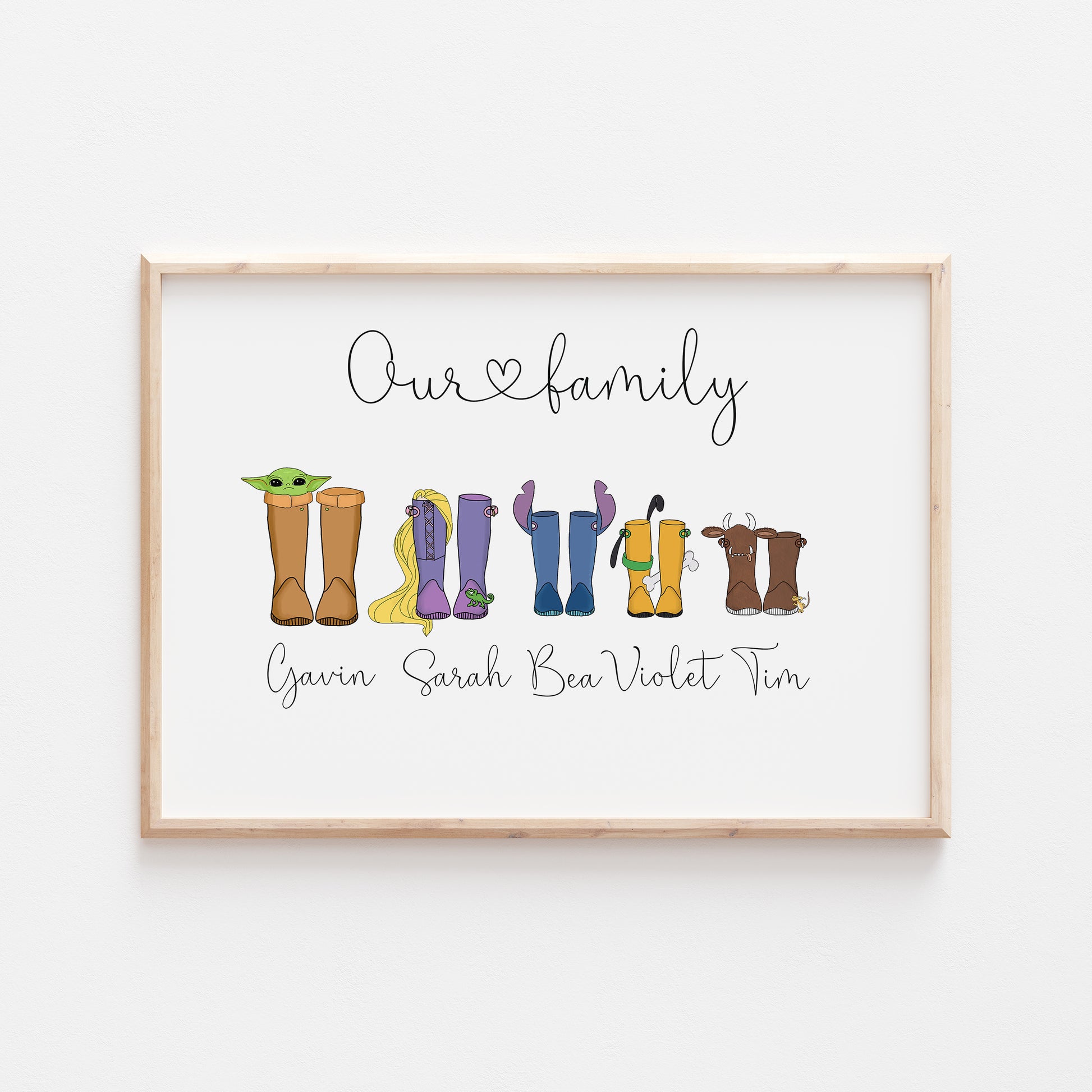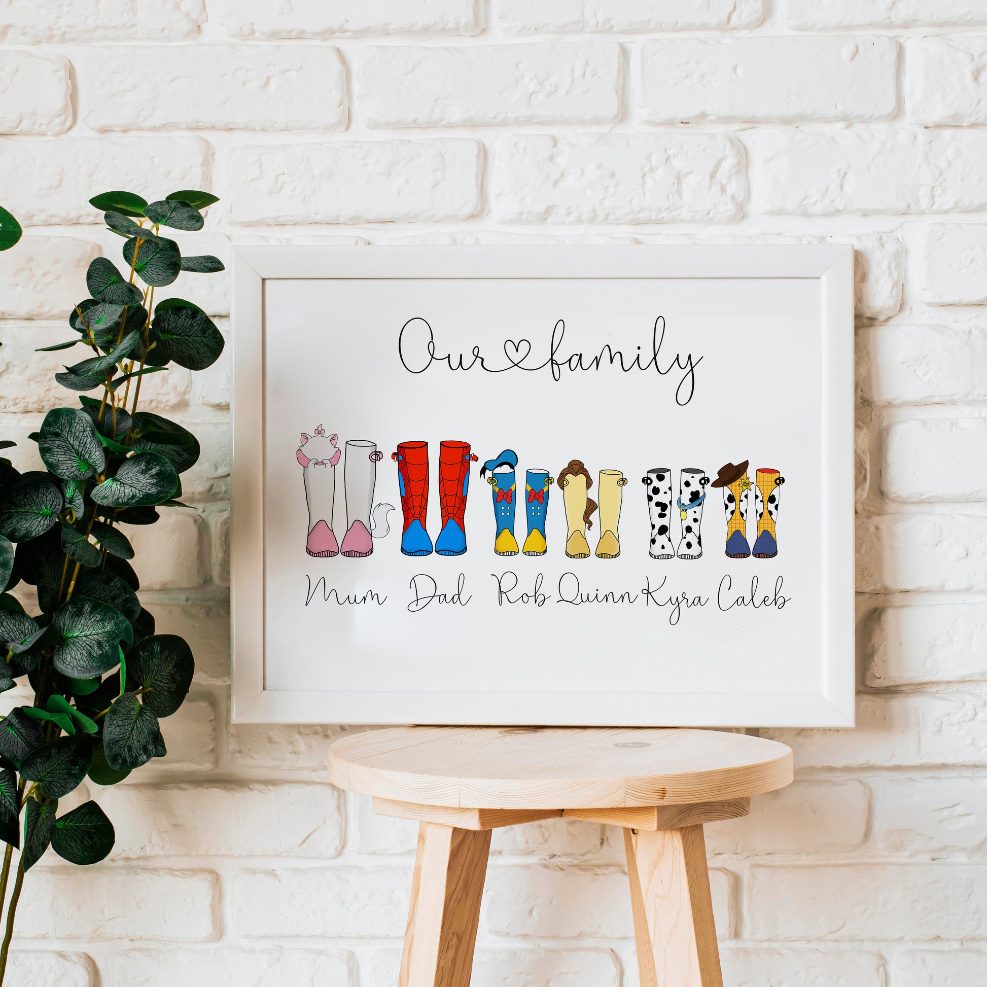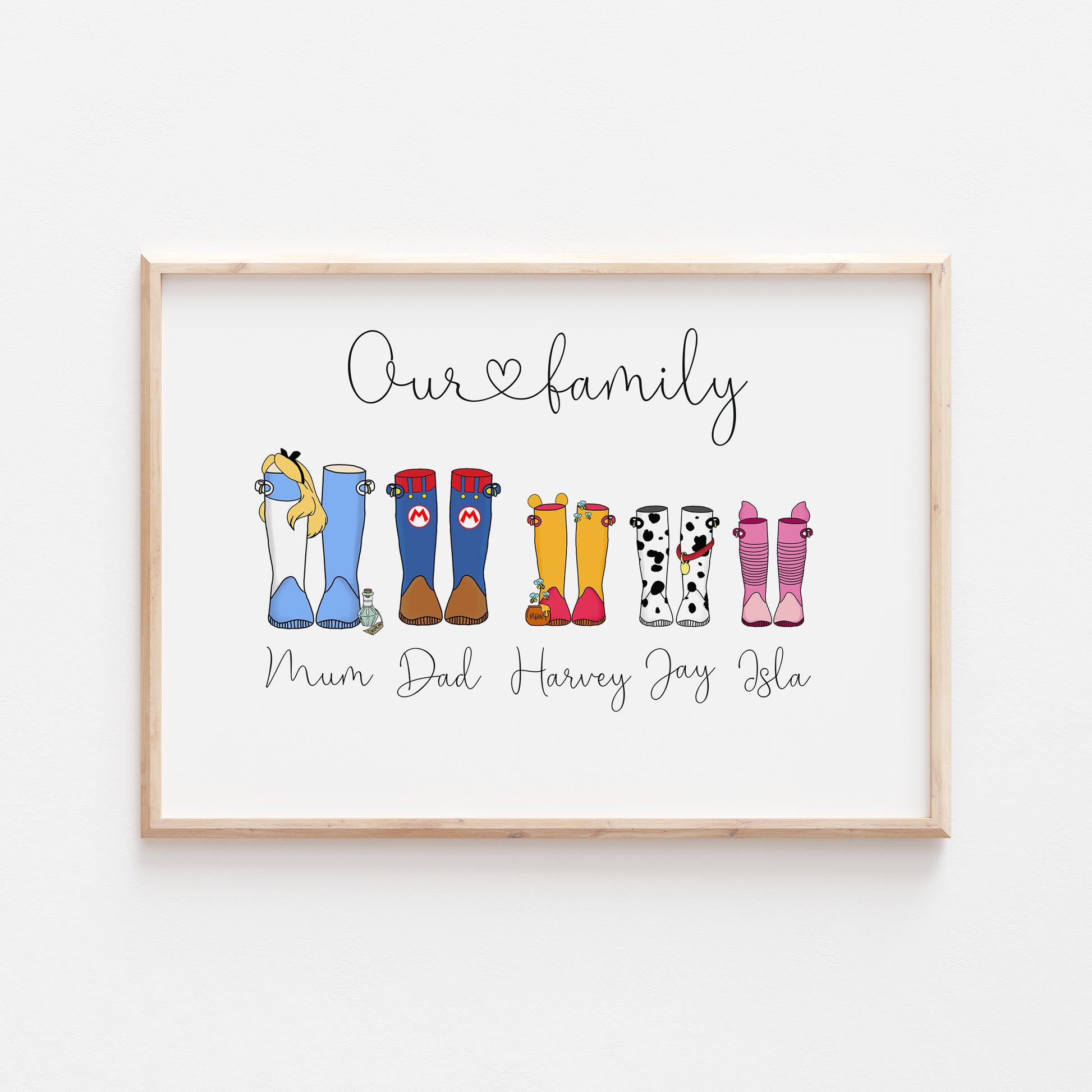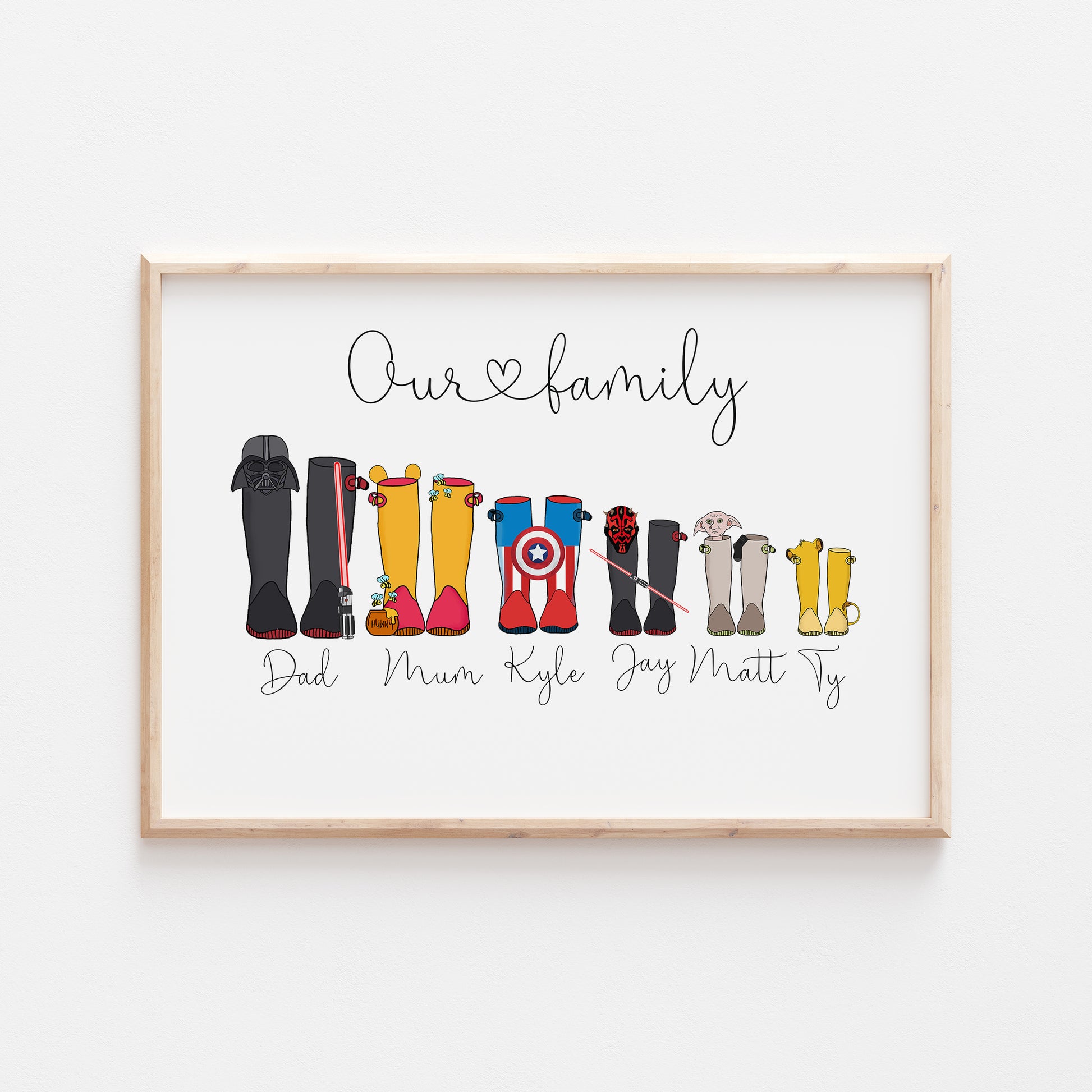 Our personalised movie themed Welly Boots print is the perfect addition to any room in your home. This personalised family print features charming illustrations of Welly Boots portrayed as your favourite characters, making it a unique and special gift for a family member or as a little treat for yourself. Choose characters from Disney, Star Wars, Simpsons, Jurassic Park and more!