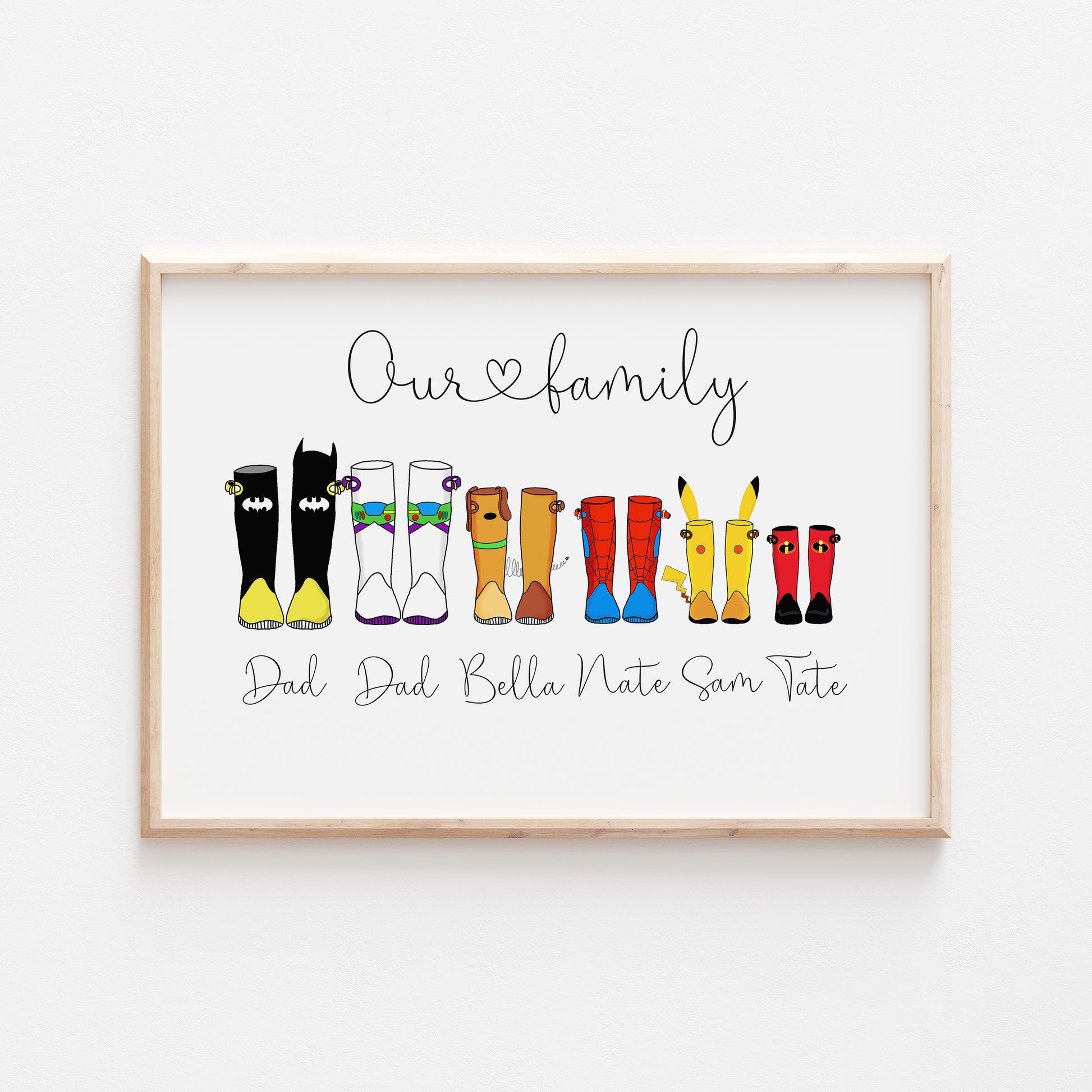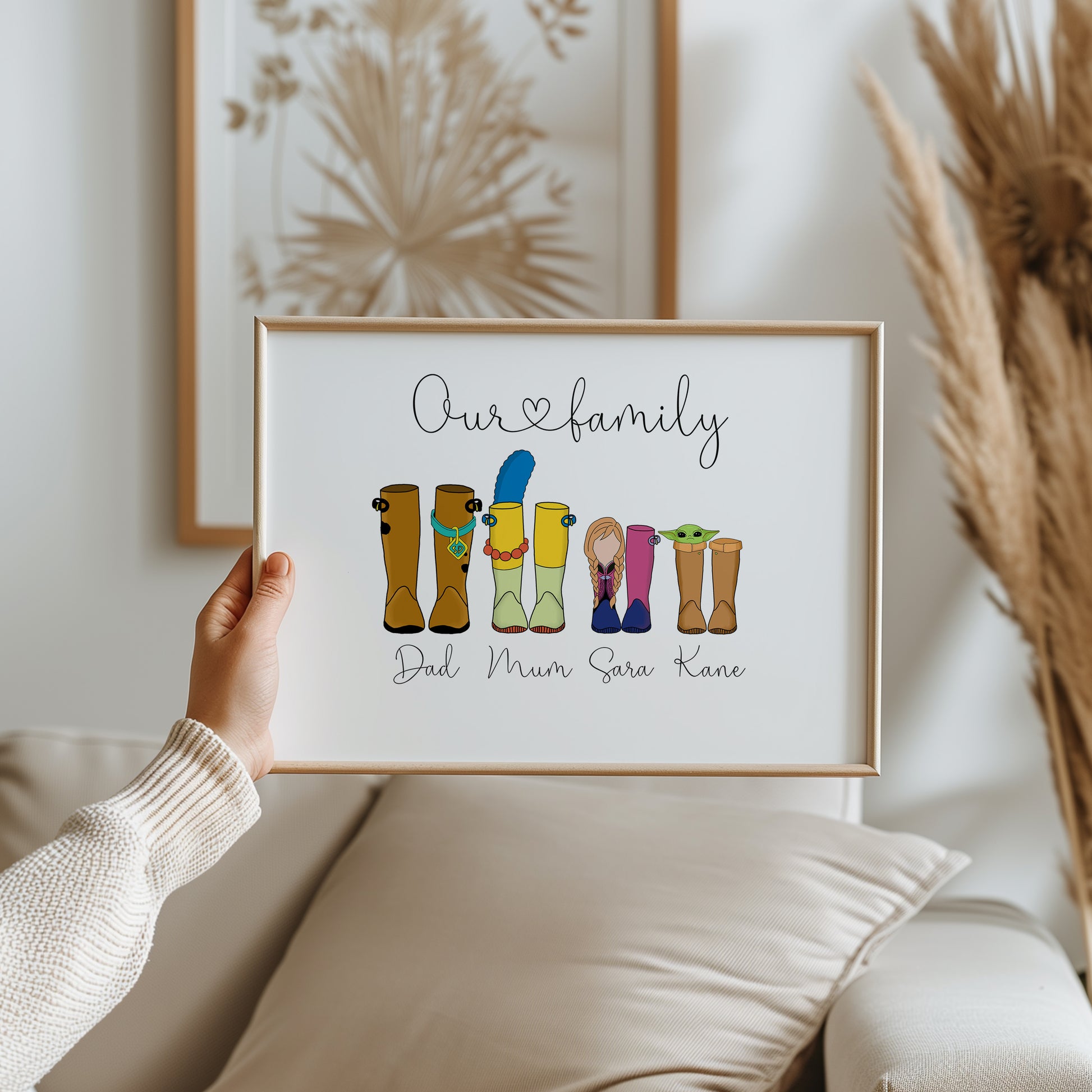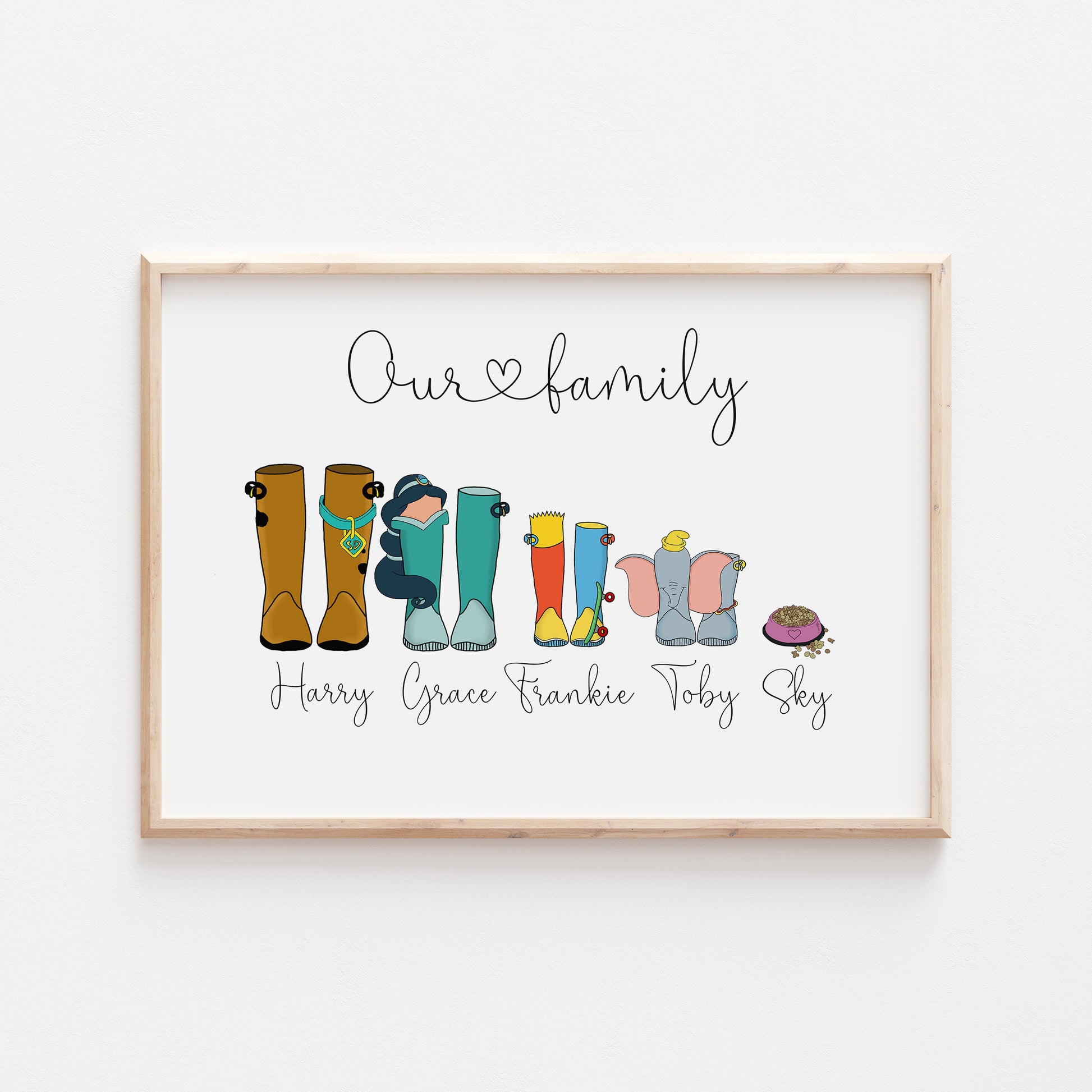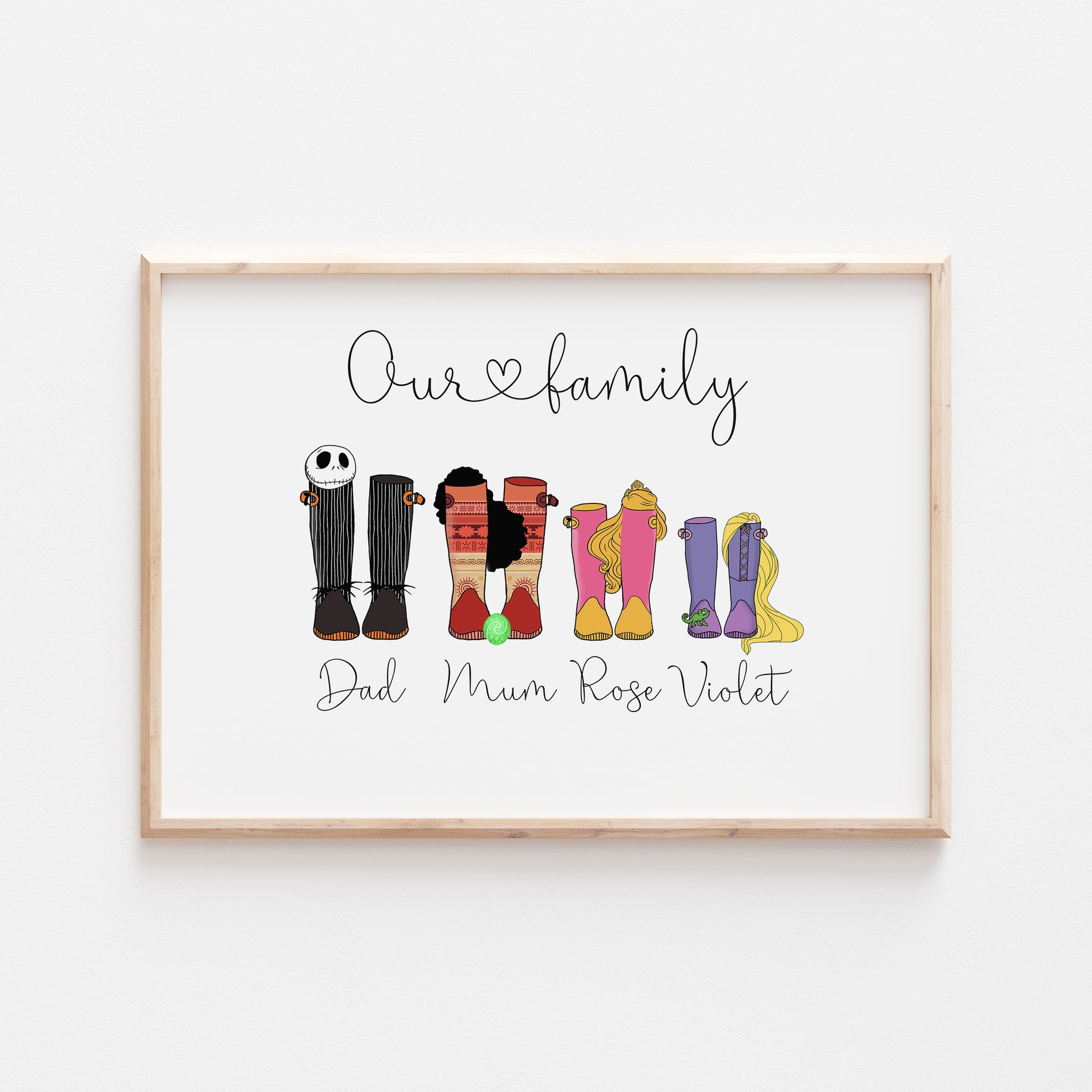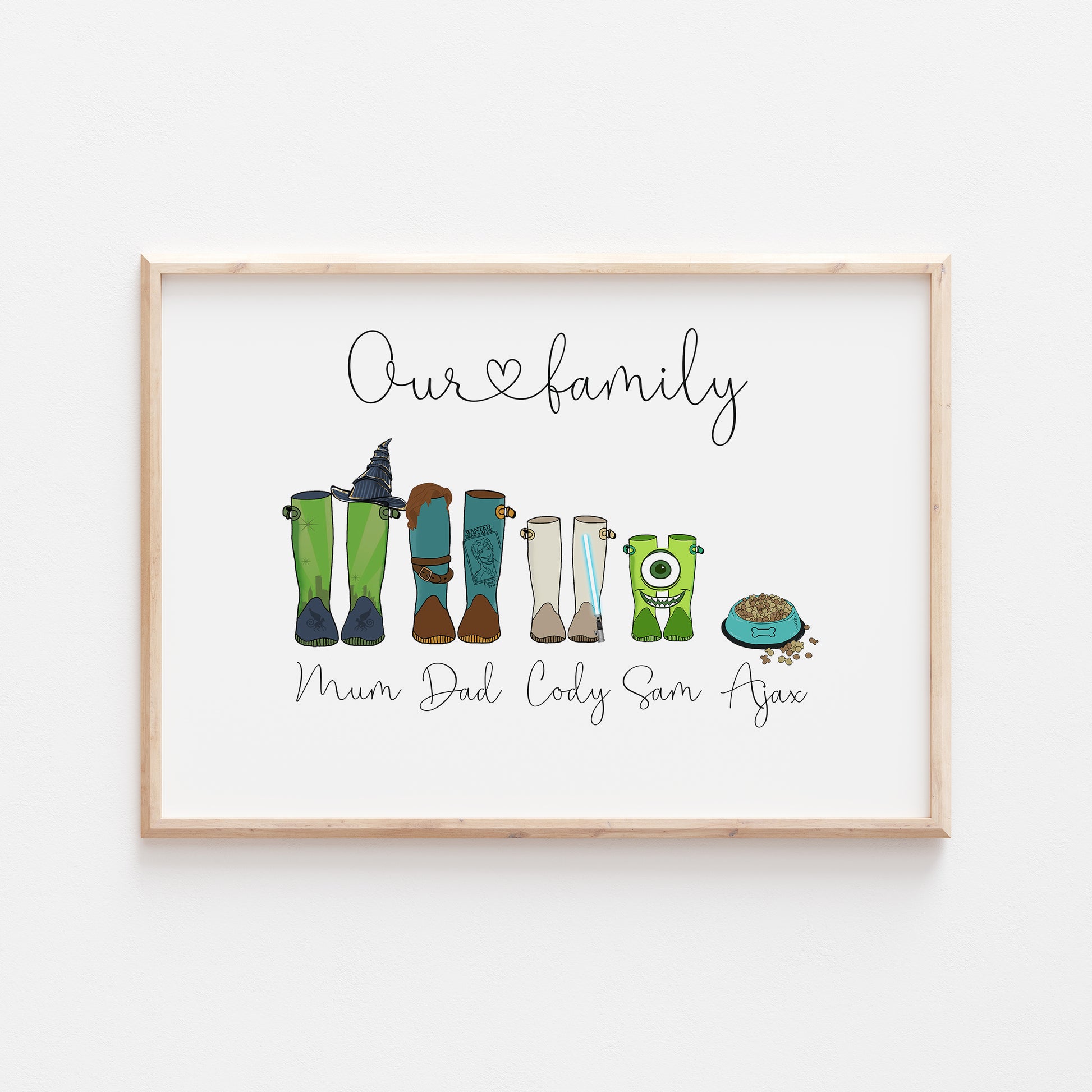 Our personalised movie themed Welly Boots print is the perfect addition to any room in your home. This personalised family print features charming illustrations of Welly Boots portrayed as your favourite characters, making it a unique and special gift for a family member or as a little treat for yourself. Choose characters from Disney, Star Wars, Simpsons, Jurassic Park and more!