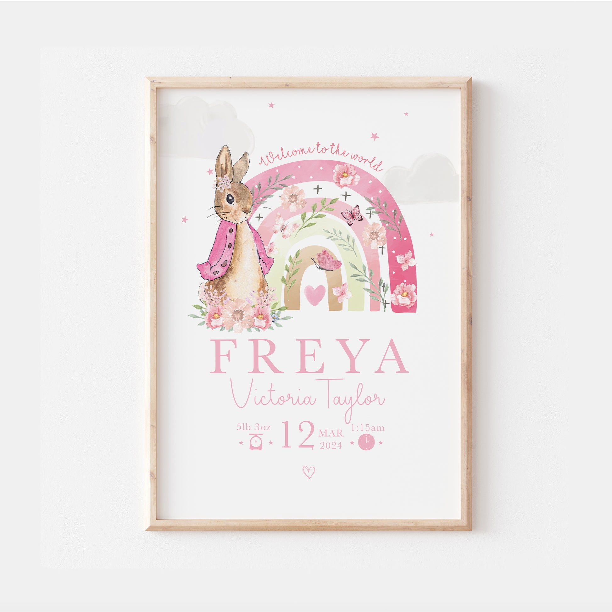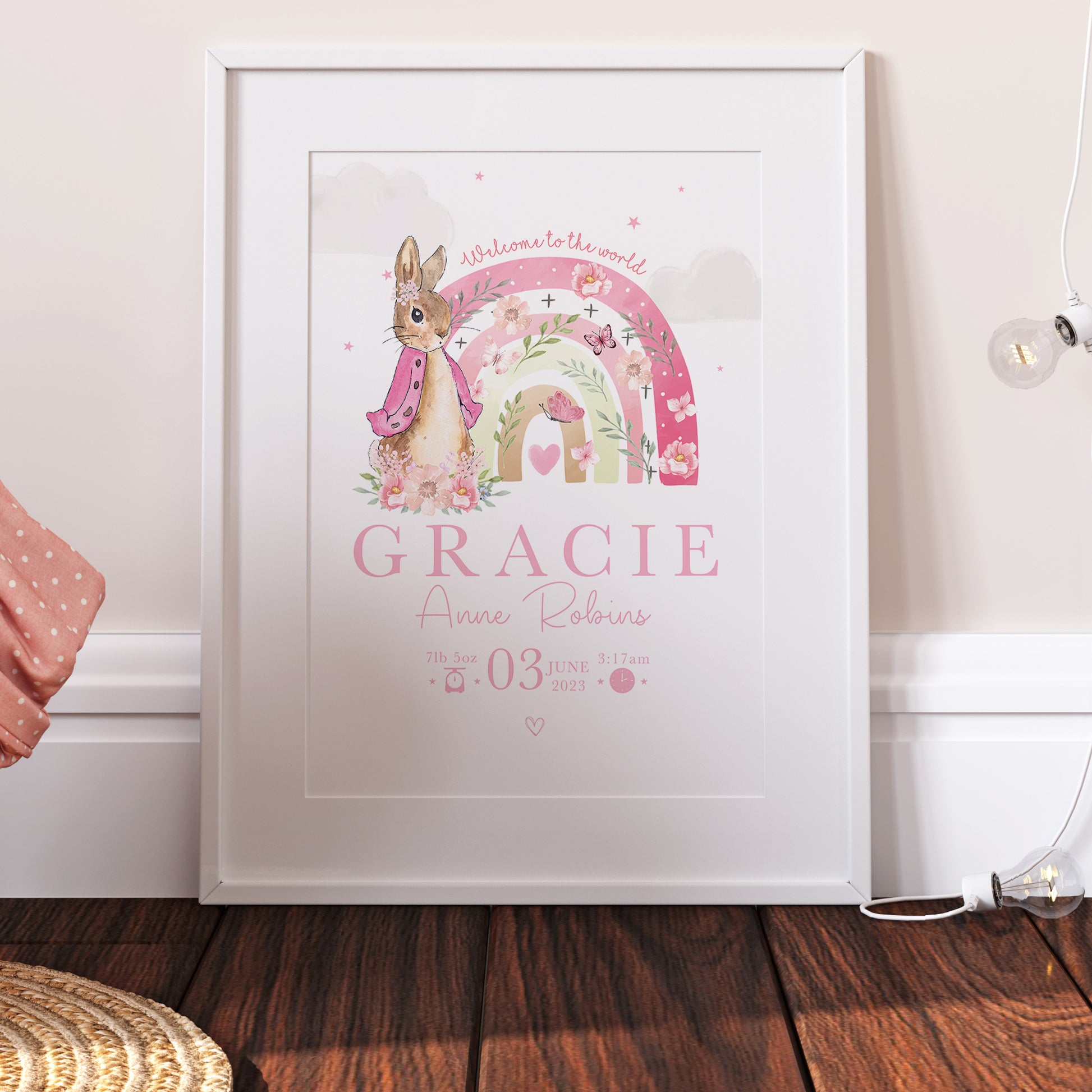 Our 'The day you were born' Pink Peter Rabbit themed rainbow print will be a great addition to your home.